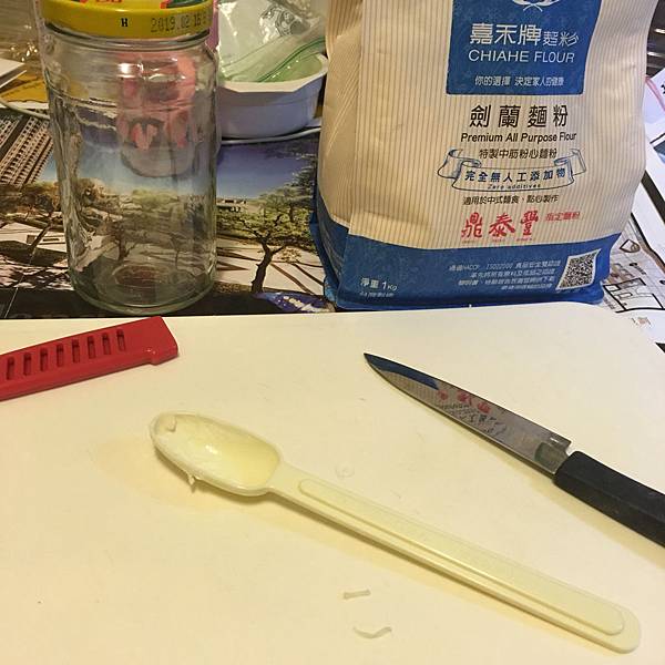 料理苦手如我上次意外做出麵疙瘩,但厲害的麵粉還剩下很多,總要用完啊。於是在金魚奶奶的陪同下,我又做了一次,這次的目標是做出成功的麵條。工具有奶粉湯匙,切菜板,盤子,水果刀,空玻璃瓶來當桿麵棍。材料一樣是那包鼎泰豐認證的麵粉,還有水。我這次不用秤子量重量了,我拿奶粉湯匙了量,大概抓2:1的比例,所以是麵粉7匙加上3匙的水。