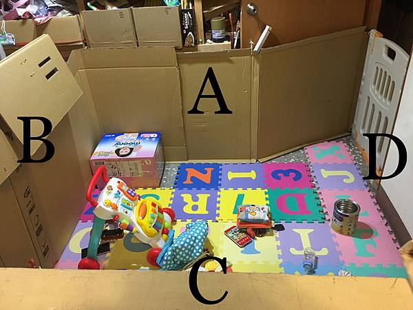 完成樣貌 覺得醜醜的,但是為了寶寶安全以及之後塗鴉空間還有做城堡的材料,就不做裝飾以及剪裁了。紙箱有80公分高,應該到女兒懂事的時候都還夠用。角落為大人休息區。本來老公想要買無印良品的懶人椅來坐,但那實在太佔空間,而且對抱寶寶站起來沒有幫助,畢竟自己要從懶人椅起身就不容易了。