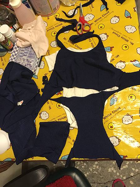 這次拿的是我國小畢業前為了去玩水買的華歌爾泳衣。年代久遠了所以沒什麼彈性了,拿來隨便剪剪壞了失敗了也才不心疼。一開始忘記拍原來的泳衣了,總之拿包屁衣(下方白色)參考一下大小,剪出這樣兩片布。(好像魟魚XD) 這樣打結。可以拆開穿好再打結或者套上去,畢竟還是有彈性。